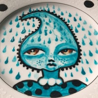 One of a kind hand painted Angie Mason art plates! A rainy day delight Tear Drop Lady looks off to the side perhaps at a scrumptious dessert! Decorate any room by hanging on your wall displaying in a cabinet or eating a delicious slice of cake off of! Size: Approx 10 inch Diameter Vintage dishes that are repurposed and hand painted with an Angie Mason twist. All signed and are dishwasher safe! :D So get a slice of cake and serve it up with a cup of tea on some Angie Mason Artwares!